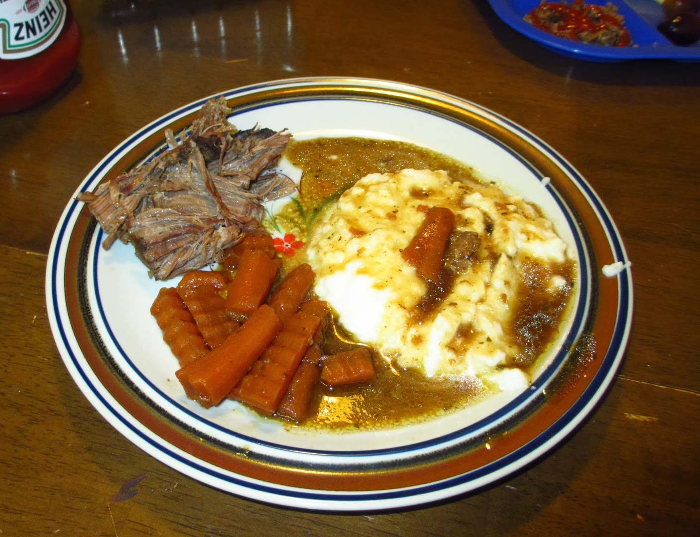 Our snow day supper- Mississippi Pot Roast, homemade mashed potatoes (with gravy), and carrots.