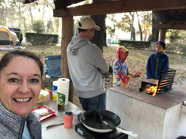 The boys were up early, as usual. It was cool so we built the fire and all huddled around it.
